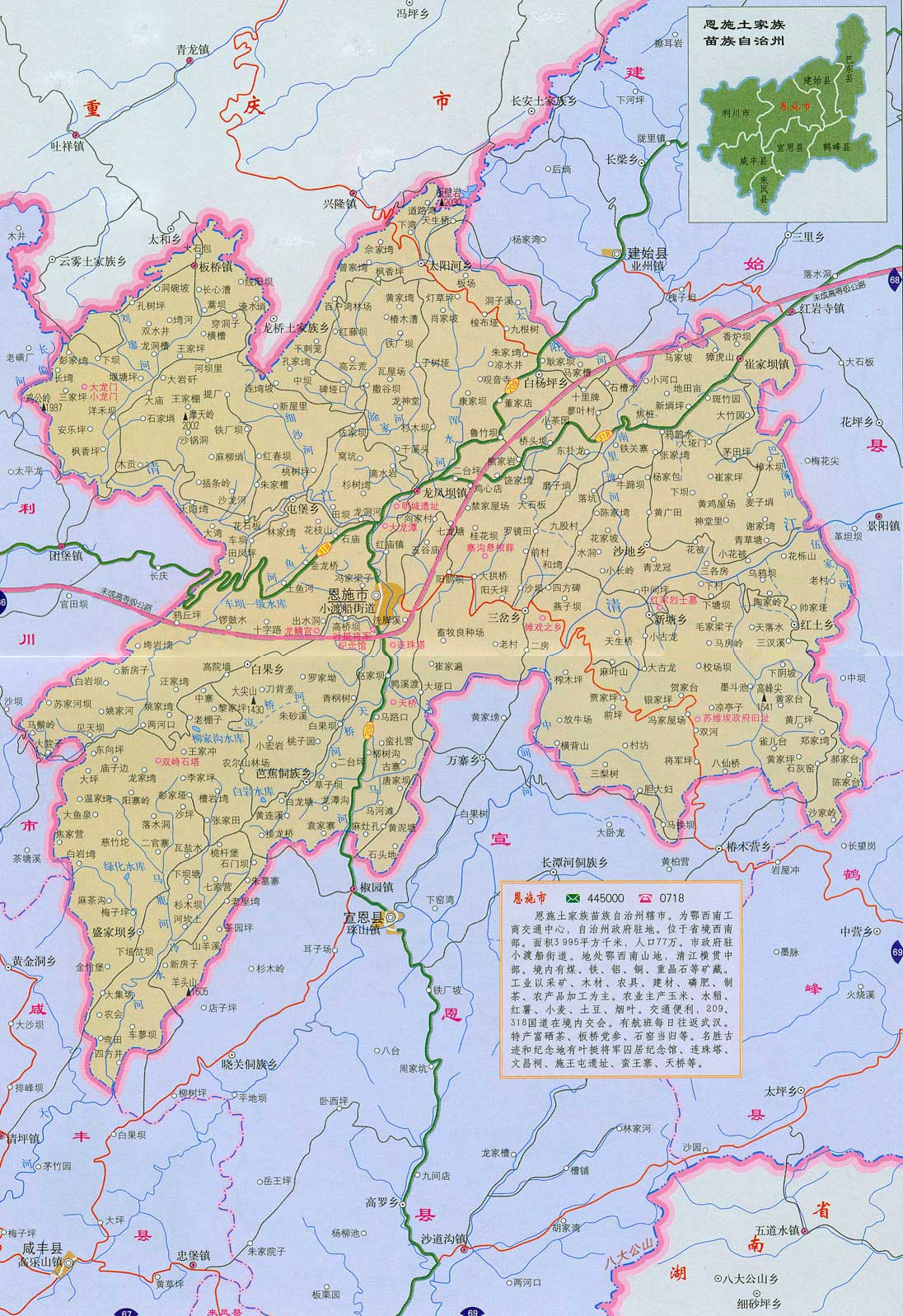 恩施土家族苗族自治州(簡稱恩施州)位于湖北省西南部,東連荊楚,南接瀟湘,西臨渝黔,北靠神農(nóng)架,國土面積2.4萬平方公里,轄恩施、利川兩市和建始、巴東、宣恩、來鳳、咸豐、鶴峰六縣。恩施州于1983年8月19日建州,是共和國最年輕的自治州,也是湖北省唯一的少數(shù)民族自治州。